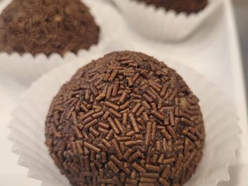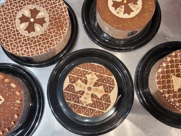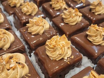 Génoise au chocolat, sirop de rhum, crème beurre au café, amandes